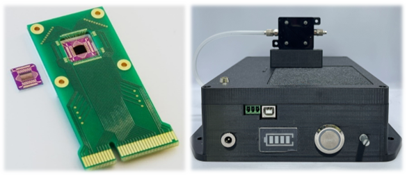 Рис. 1. Разработанные мультисенсорный графеновый чип (слева) и блок «Электронный нос» на его основе (справа)