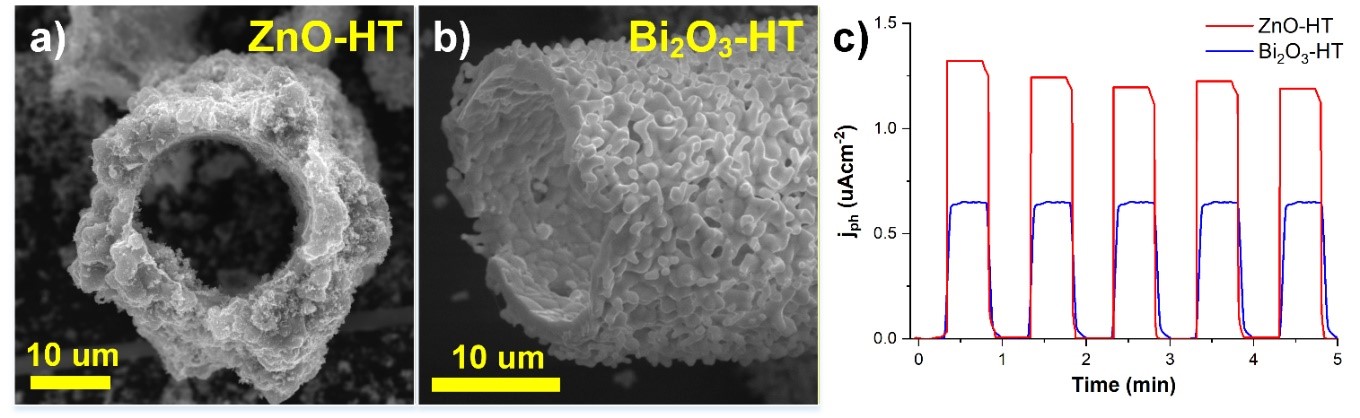 Рис. 1. Микротрубки ZnO (a) и Bi2O3 (b), полученные электрохимическим темплатным методом, и фототок при 1,5 В vs RHE под облучением 410 нм (c), демонстрирующий повышение ФЭХ-активности вследствие морфологической оптимизации