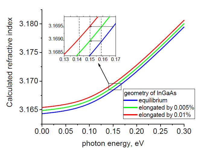 Рис.1 Результаты моделирования энергетической зависимости температурного коэффициента показателя преломления для InGa0.5As0.5 и результаты аналитического вычисления задержки включения в сравнении с экспериментом.