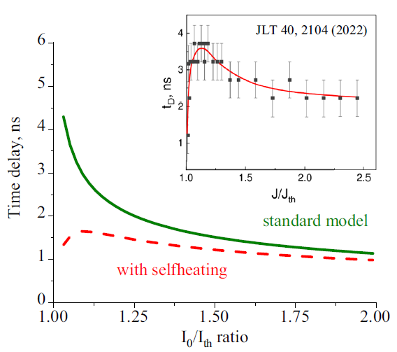 На основе теории нормальной дисперсии впервые получена энергетически разрешенная температурная зависимость показателя преломления в окне прозрачности типичных соединений семейства III–V (Рис.1а), убедительно подтвержденная экспериментом [1]. Результаты исследования позволяют определять перегрев активной области квантового каскадного лазера без численного расчёта уравнения теплопроводности. На основе исследований фундаментальных аспектов рассеивания тепла в квантовых каскадных лазерах среднего инфракрасного диапазона аналитически и численно описано влияние нагрева активной области на задержку включения [2] (Рис.1б). Предложенная модель описывает характерные немонотонности, наблюдаемые в эксперименте по измерению задержки включения, а также позволяет определять основные мощностные и электрические характеристики лазера, что не было осуществимо в ранее предложенных теоретических описаниях. Полученные результаты обеспечивают практически применимый инструментарий для оптимизации лазеров нового поколения.