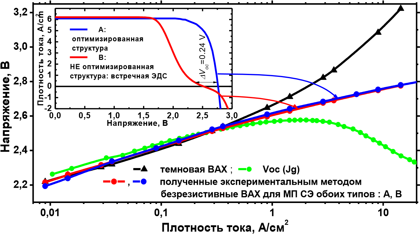 Рис. 1. Пример применения разработанного экспериментального метода к двум МП СЭ. Совпадение ВАХ (А) и (В) говорит о том, что входящие в состав каскада фотовольтаические p-n переходы одинаковы и обладают равным фотоэлектрическим потенциалом, тогда как гетероструктура (В) имеет отличительные особенности в виде встроенного туннельного диода с большой встречной фото-эдс